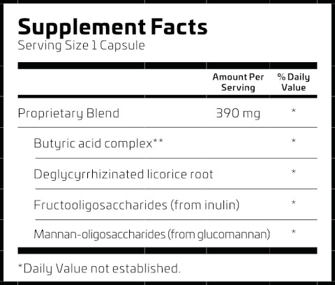 CyLoc ™ matriz de fibra de alfa dextrina Complejo de ácido butírico 300 mg. *, Cápsula de hipromelosa (derivada de la celulosa), metilcelulosa, isomalto-oligosacáridos, laurato de calcio, l-isoleucina, amilasa vegetal.** Ácido butírico estabilizado como soluble , ácido graso libre individual puro en una trampa molecular de matriz de hexadextrina combinada con el agente de liberación DexKey ™ (patente pendiente, Al Czap, Czap R&D, con licencia de Tesseract Medical Research, LLC) CyLoc ™ y DexKey ™ son marcas comerciales de Tesseract Medical Research, LLC .
